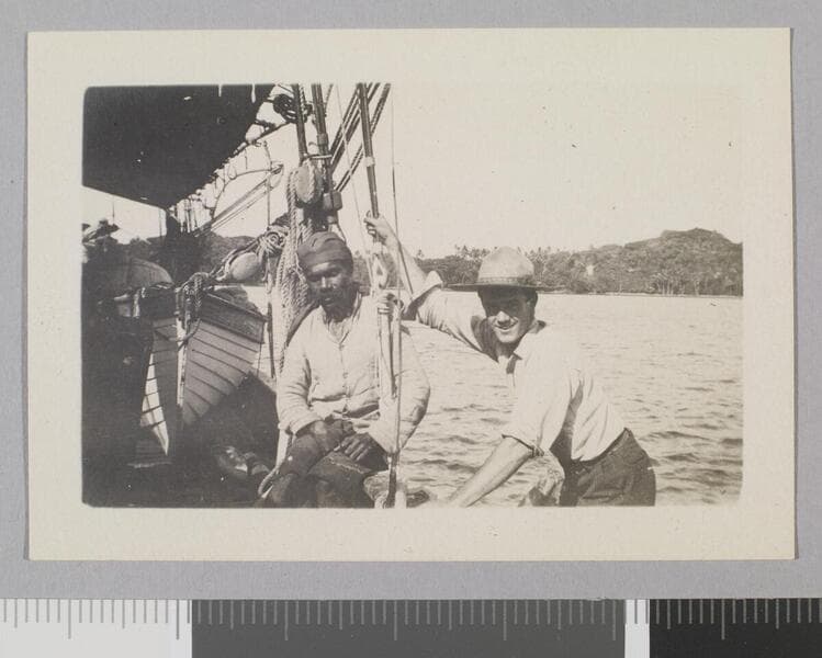 Martin Johnson stands on deck of the Snark with an indigenous islander to the right.