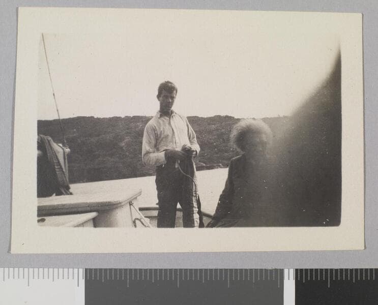 Two indigenous Oceanian men stand on deck of the Snark with lifeboat and rigging behind them.