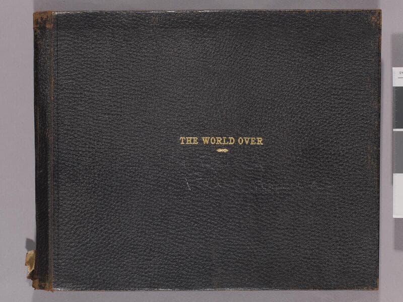 Bound in textured black material. The title "Over the World" is embossed in center of cover in gold lettering. The number "81" is affixed to the top of spine with glue. Images are primarily picture postcards and souvenir photographs collected by Charmian London. Also included are a handful of photos of Ernest and Gerhard Untermann taken in Colorado and Utah. Relationship to the Londons unknown.
