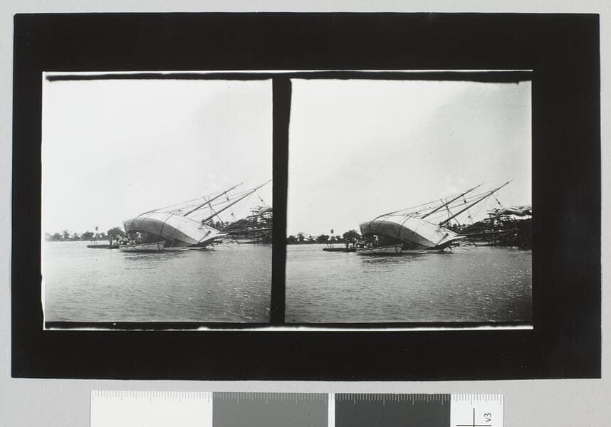 Jack and Charmian London sit on the edge of a life boat from the Snark which is in on blocks in a shipyard.