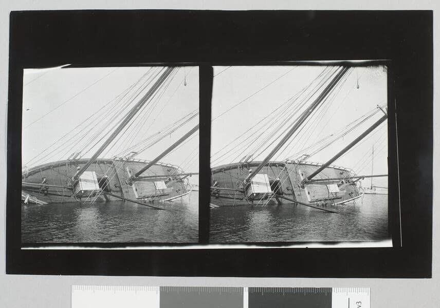 Bottom of two-masted sailboat near shore on its side. A small boat and a few people on dock sit along side it.