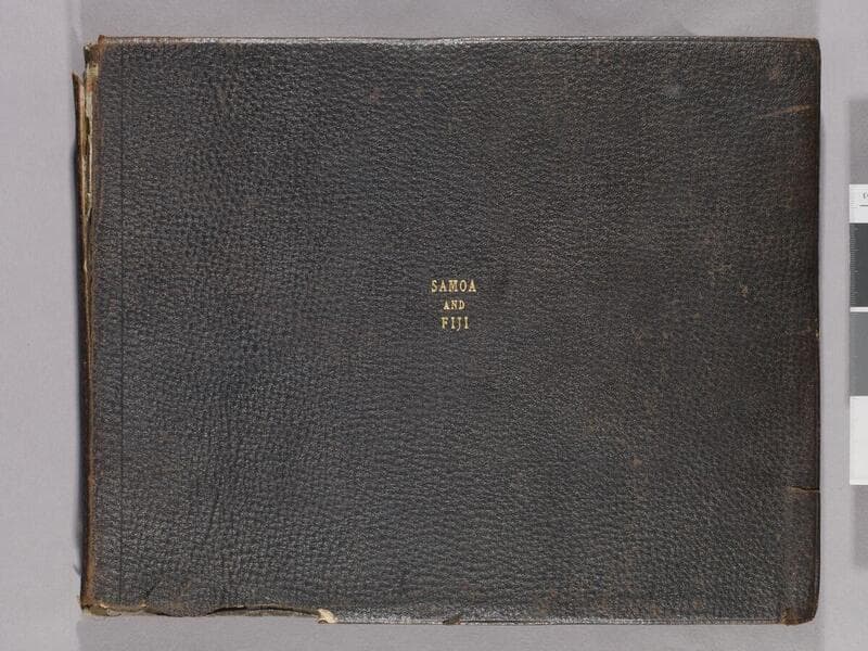 Album is bound in black textured material. The title, Samoa, Fiji, New Hebrides," is embossed in the center of cover in gold lettering. Images are primarily souvenir postcards and portraits, and some clippings, of indigenous islanders, and, western traders and missionaries who the Londons met on their travels.