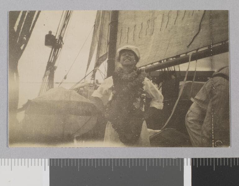 Charmian London stands on deck of ship holding hat in the wind.