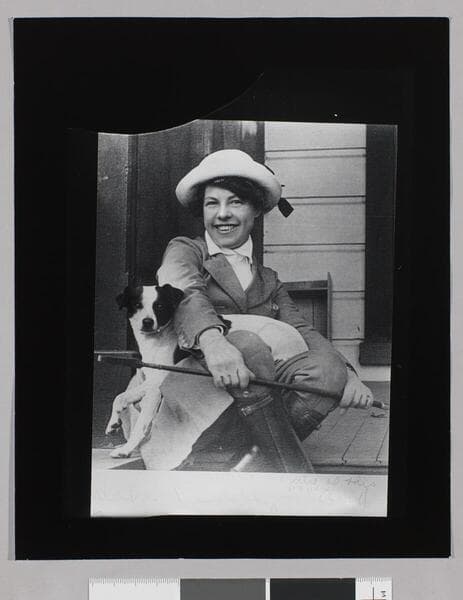 Charmian London sits astride horse in riding clothes, Jack London is bent over one of the horse's feet. Possum the dog in lower right corner.
