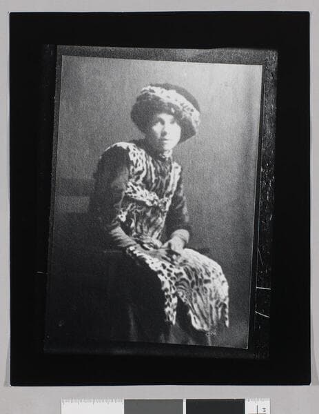 A three-quarters length seated studio portrait of Charmian London wearing a light colored dress and a hat tipped at an angle. She is turned to the left and has her left hand on her hip.