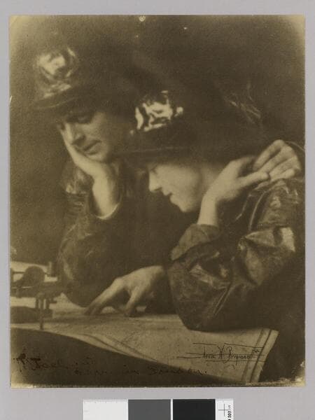 A studio portrait of Jack and Charmian London dressed in raincoats and hats. They are seated at a table, looking at a map, with a sextant on the left.