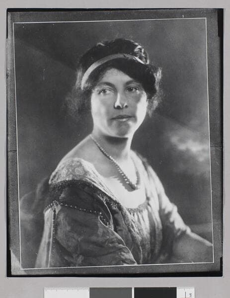 A bust-length studio portrait of Charmian London with her body turned to the right and face turned to the camera.