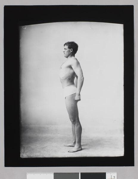A full-length standing studio portrait of Jack London wearing only underwear. He is turned in profile to the left.