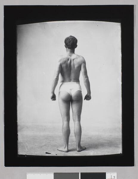 A full-length standing studio portrait of Jack London wearing only underwear. He is facing the camera, with his chest pushed out and his hands on his hips.