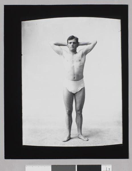A full-length standing studio portrait of Jack London wearing only underwear. He is facing away from the camera, with his hands clenched by his sides.