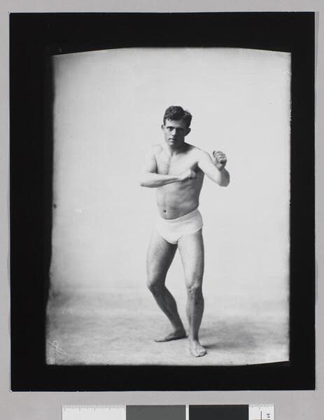 A full-length standing studio portrait of Jack London wearing only underwear. He is facing the camera in a fighting stance, with his hands balled into fists in front of him.
