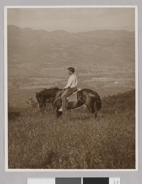 Jack London sits on horseback on Jack London Ranch with vista of fields and valley in background.