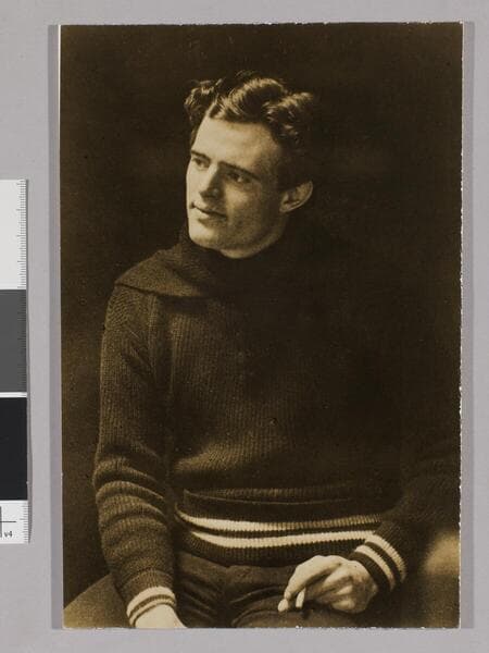 A half-length studio portrait of Jack London turned to the left, with his arms resting on the back of a wooden chair. He is holding a cigarette in his right hand, and has turned his face towards the camera.