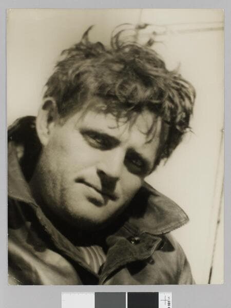 A chest-length studio portrait of Jack London wearing a pinstriped jacket, white shirt, and tie. His body is turned slightly to the right.