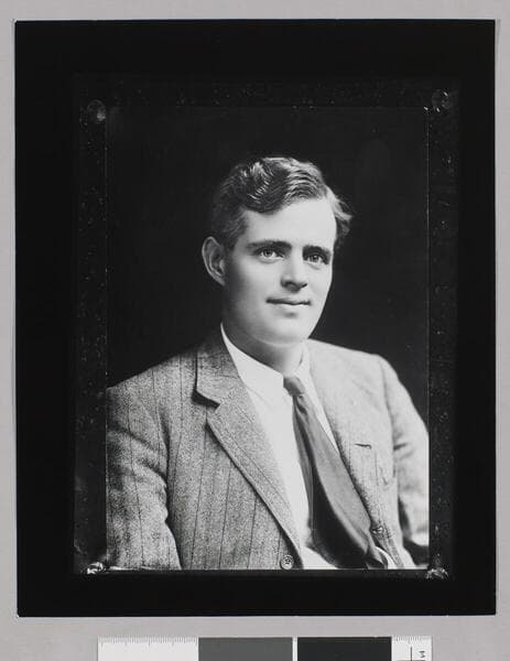 A chest-length studio portrait of Jack London wearing a dark suit and white shirt and tie. He is facing the camera with his gaze turned slightly to the right.