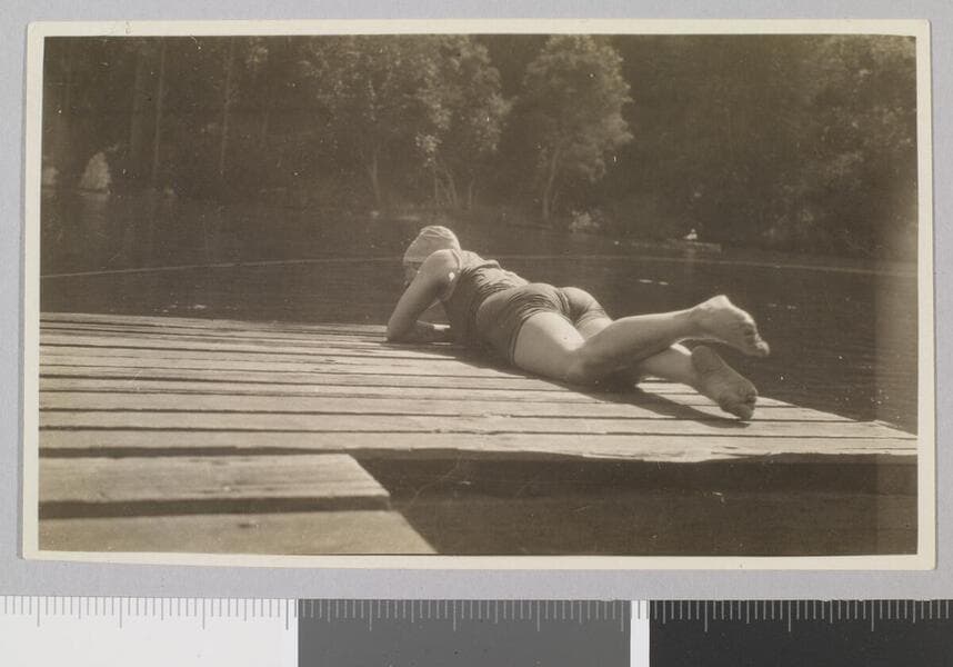 Charmian London stands in with back to camera in a bathing suit and hair loose, on the shore of creek, probably near Wake Robin Lodge.