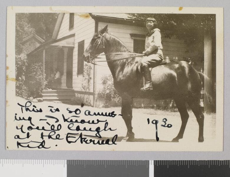 Charmian London sits sidesaddle on draft horse on Jack London Ranch.