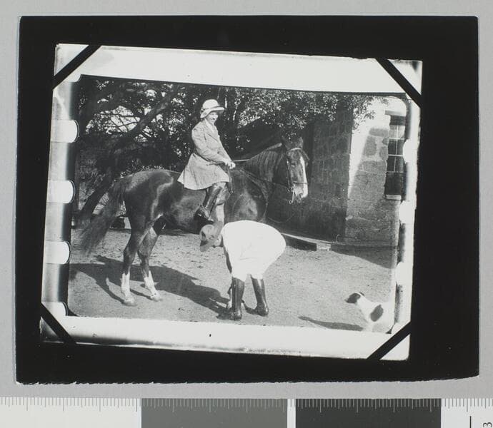 Charmian London sites astride horse near lake on Jack London Ranch.