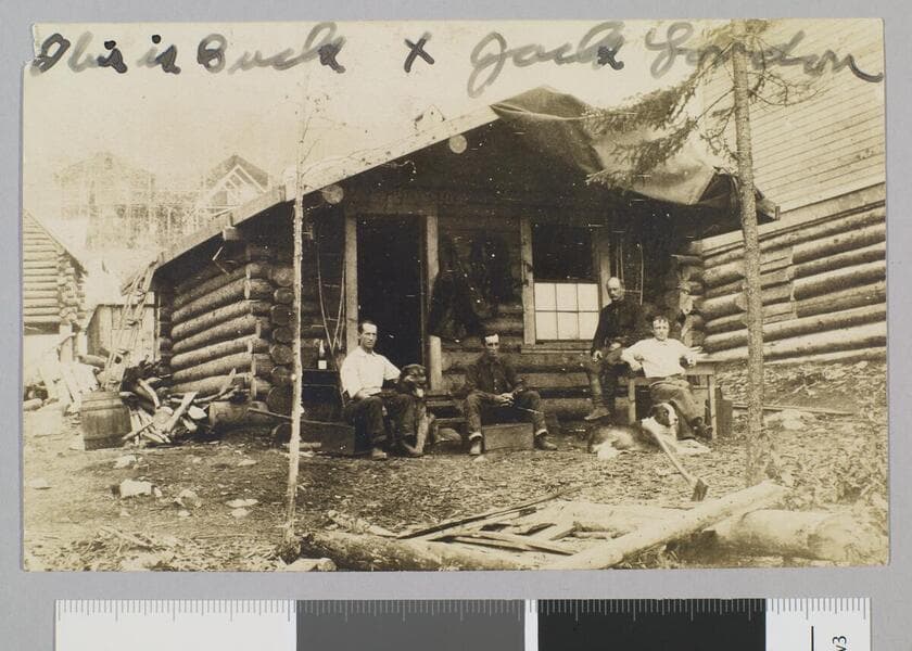 Marshall Bond, Oliver H. R. La Farge, Lyman R. Cold, and Stanley Pearce sit with dog in front of log cabin in Dawson, Yukon. Typed title and signature of Jack London on bottom of print.