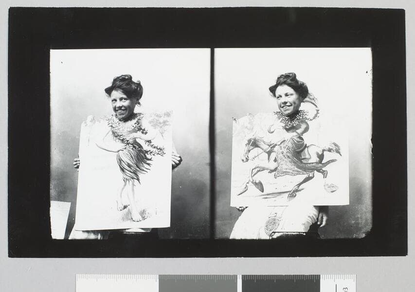 Jack London sits and poses with head in two different cut-out stand-ins, one a figure in boat with shark, the other a figure in plaid outfit holding a fish.