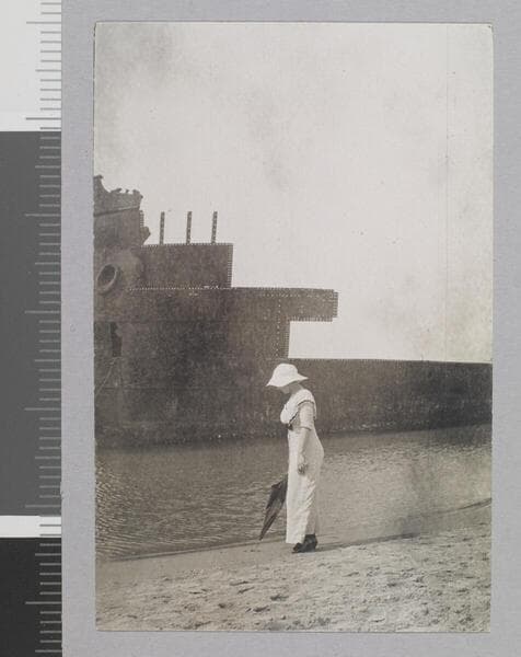 Charmian London stands at shoreline of creek on Jack London Ranch.