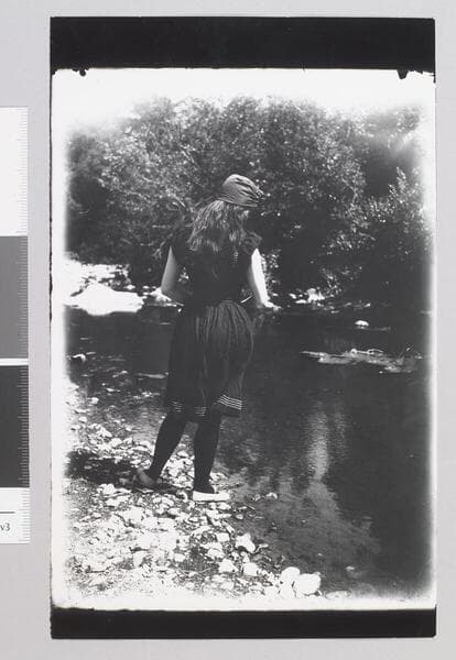 Charmian London in bathing suit lies chest down on dock over lake on Jack London Ranch.