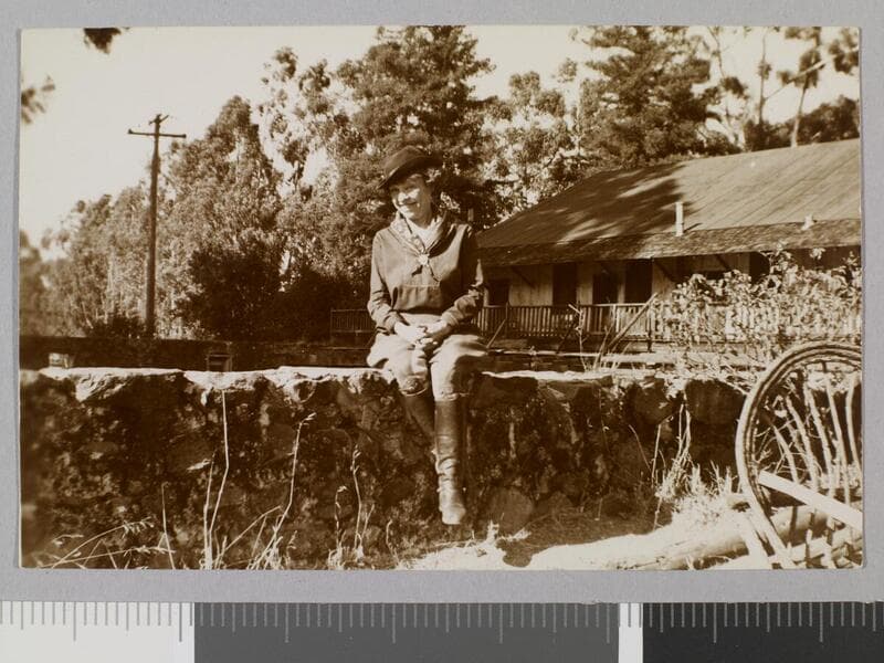 Charmian London sits sidesaddle on draft horse on Jack London Ranch.