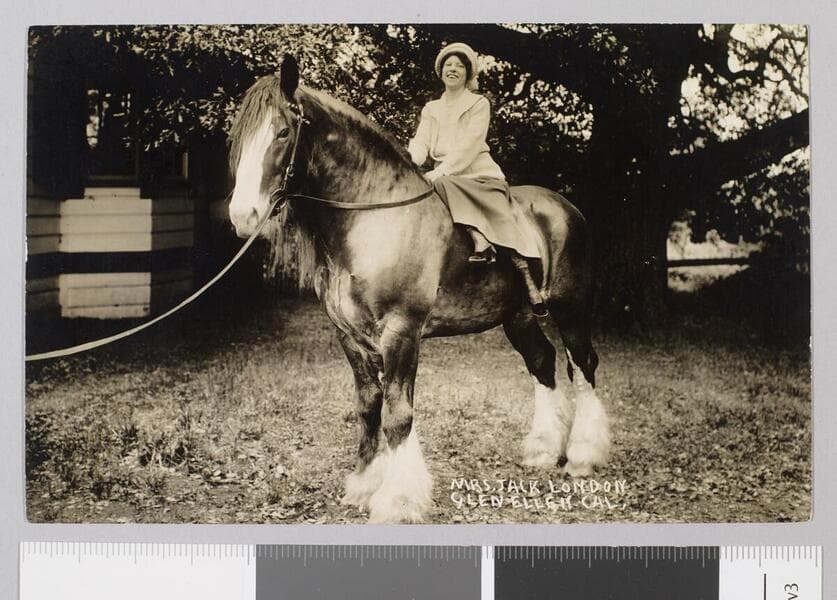 Charmian London sits astride horse in riding clothes, Jack London is bent over one of the horse's feet. Possum the dog in lower right corner.