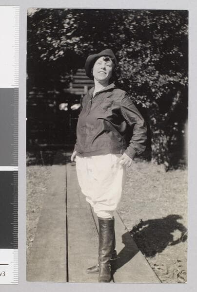 Charmian London sits on stone fence wearing riding boots on Jack London Ranch.