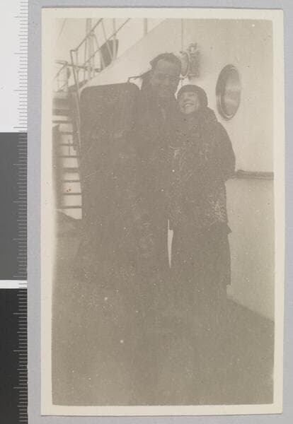 Jack and Charmian London stand on ship's deck at top of gangway. Both are wearing leis.