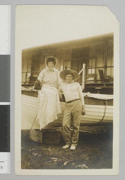 Jack London stands and Charmian London sits on edge of lifeboat which is on land set on blocks.