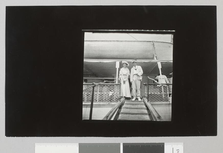 Jack and Charmian London sit together on deck of ship with part of sail and cordage behind them.