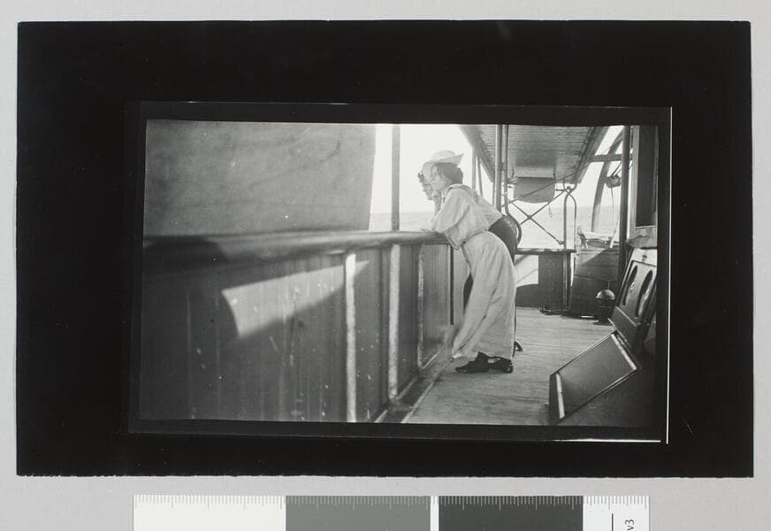 Charmian London stands on deck of ship holding hat in the wind.