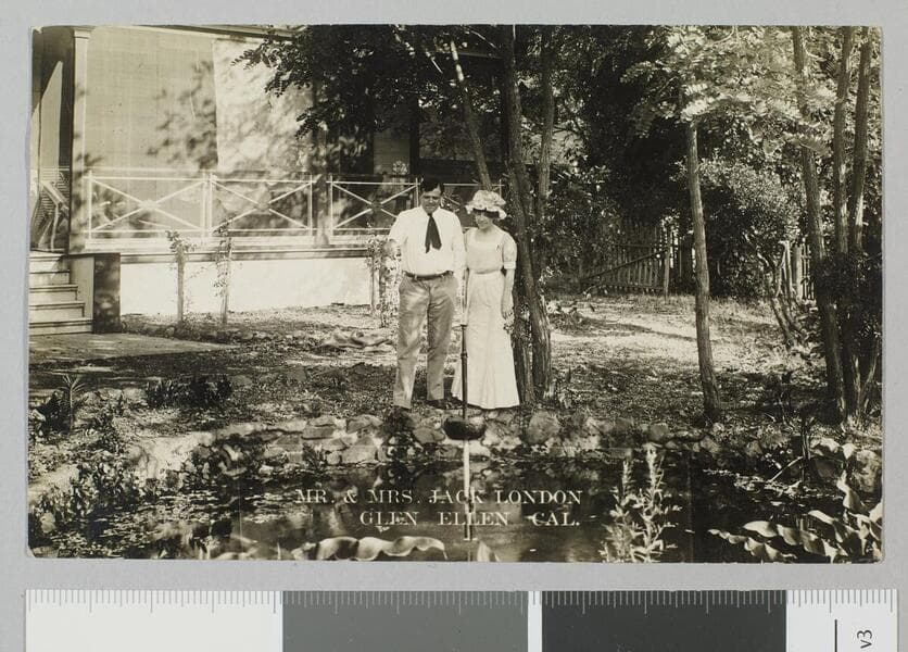 Jack and Charmian London stand beside fish pond on Jack London Ranch.
