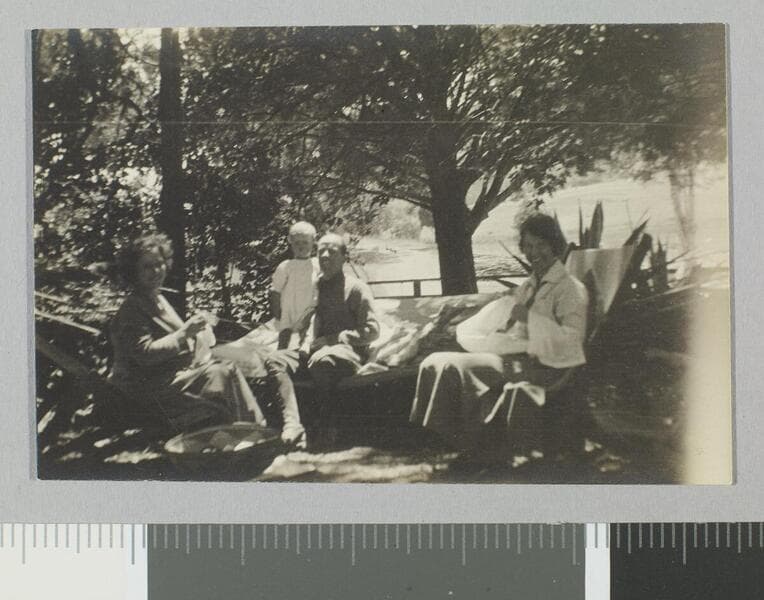 Laurie Smith, wife Evelyn, and child sit outdoors on Jack London Ranch.