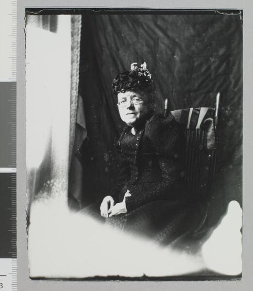 Three women pose for photograph outside in front of an ivy hedge. Women on front left sits on a rustic wood bench holding a box on her lap. Women in back center stands amid the ivy behind her. She wears a wide-brimmed hat, one hand placed on sitting woman's shoulder. Women in the front right sits on the ground wearing a dark dress.