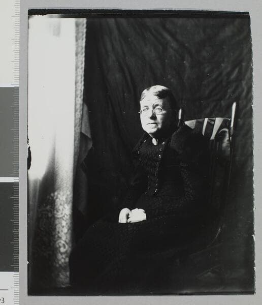 Charmian London sits on porch steps of the ranch cottage in Glen Ellen, California. She wears a hand and boots, holds a riding crop in front of her legs, and Possum the dog sits in her lap.