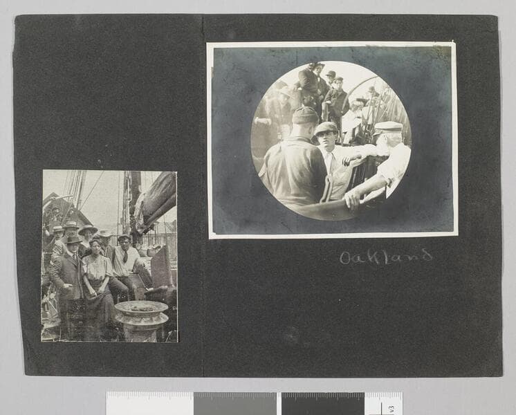 Jack and Charmian London stand on ship's deck at top of gangway. Both are wearing leis.