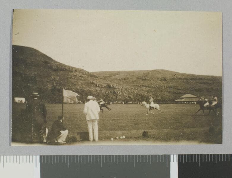 Jack London in white jacket and hat with back to camera faces polo grounds.