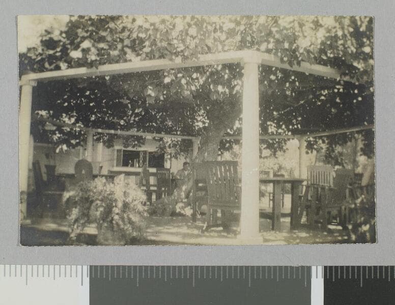 Jack London stands and Charmian London sits on back stops of cottage on Jack London Ranch.