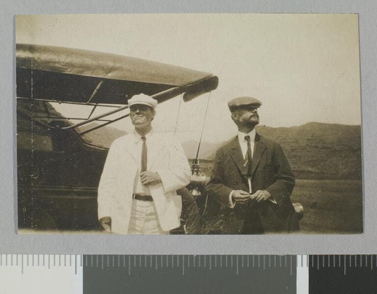 Jack London, wearing a white suit and holding a camera, and and unidentified man stand in front of automobile.