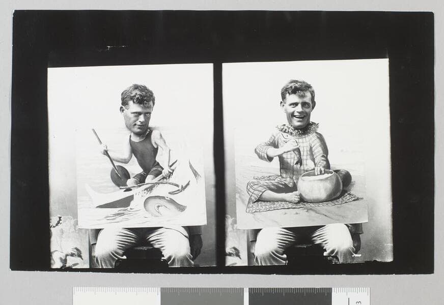 Charmian London poses with two different cut out photo stand-ins, one a hula dancer, one a person on horseback.