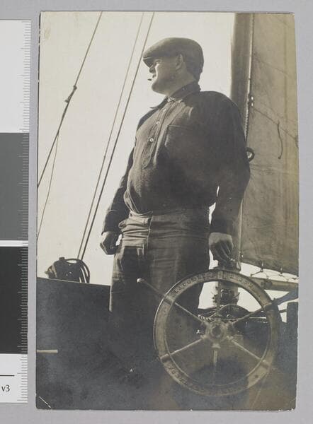 Jack London sits leaning forward with sky behind him. Verso of photo reads: "Anna."