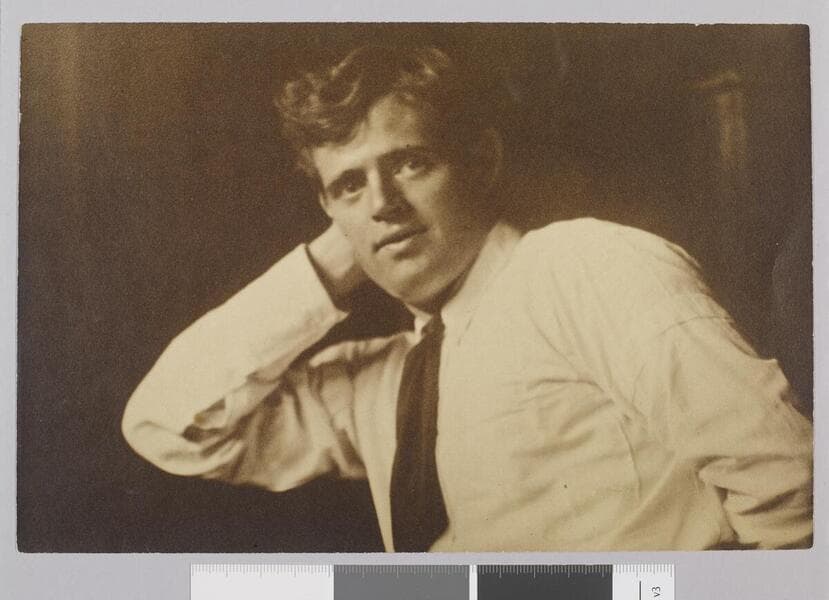 A half-length seated studio portrait of Jack London in a sweater, with his head turned to the left, holding a cigarette in his left hand.