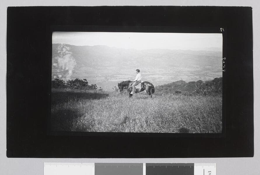 Jack London sits on a dark horse in a field of grass, with a view of hills and a valley in the background.