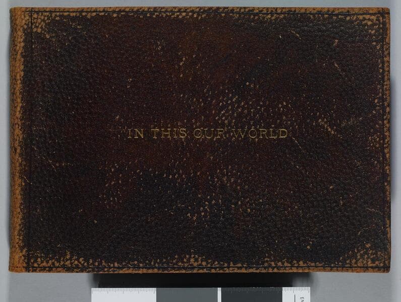 Bound in textured black material. The title "Over the World" is embossed in center of cover in gold lettering. The number "81" is affixed to the top of spine with glue. Images are primarily picture postcards and souvenir photographs collected by Charmian London. Also included are a handful of photos of Ernest and Gerhard Untermann taken in Colorado and Utah. Relationship to the Londons unknown.