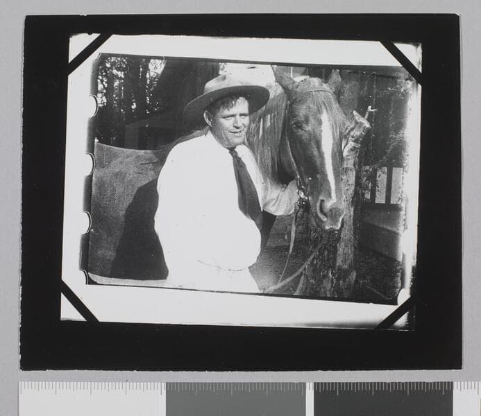 Jack London stands with hands on horse in front of building on Jack London Ranch.