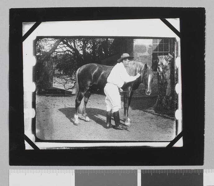 Jack London stands with hands on horse in front of building on Jack London Ranch.