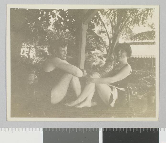 Jack and Charmian London sit together on deck of ship with part of sail and cordage behind them.