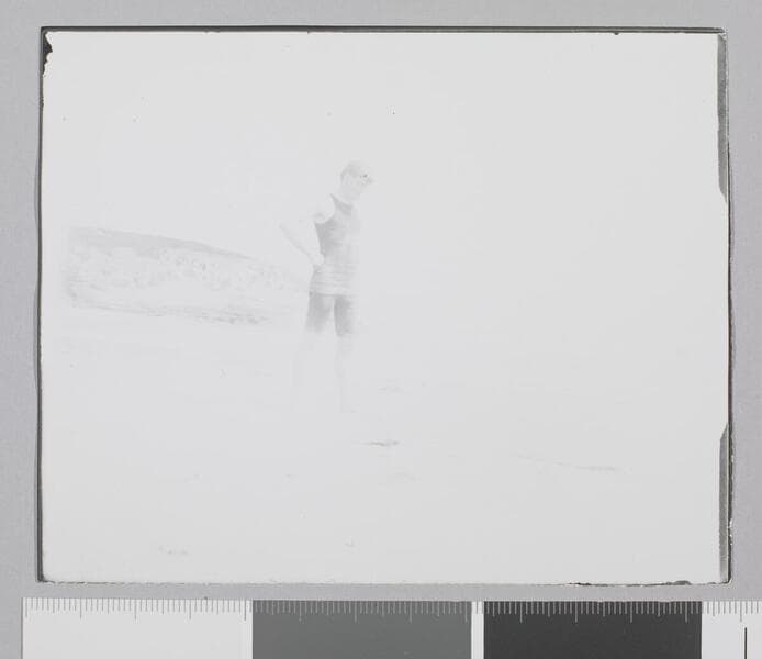 Charmian London stands in with back to camera in a bathing suit and hair loose, on the shore of creek, probably near Wake Robin Lodge.